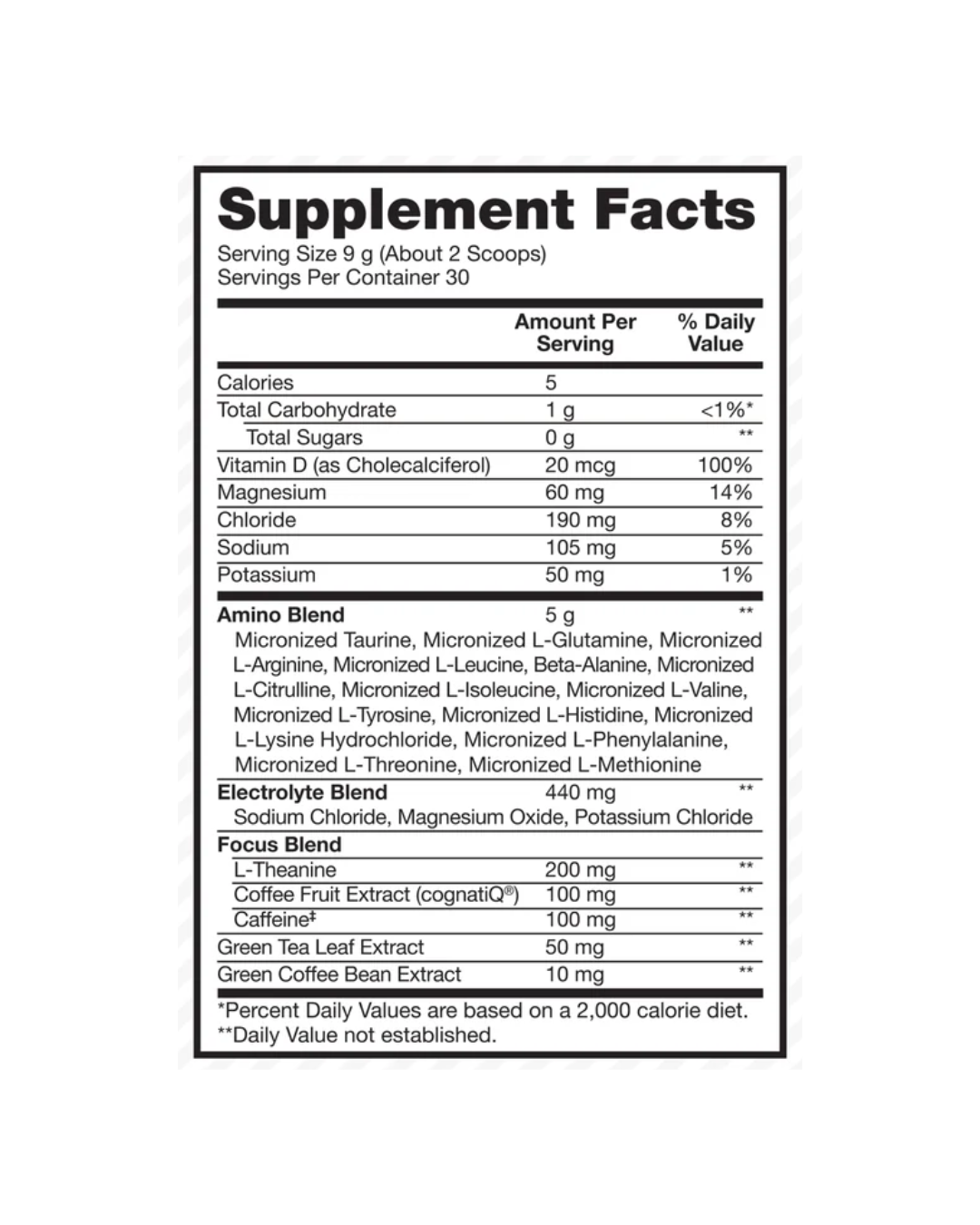 Aminoácidos de forma libre micronizados para una absorción más rápida que apoya la recuperación antes, durante y después del ejercicio. Cafeína de fuentes naturales. Incluye electrolitos para respaldar el rendimiento, la resistencia y una vida activa.