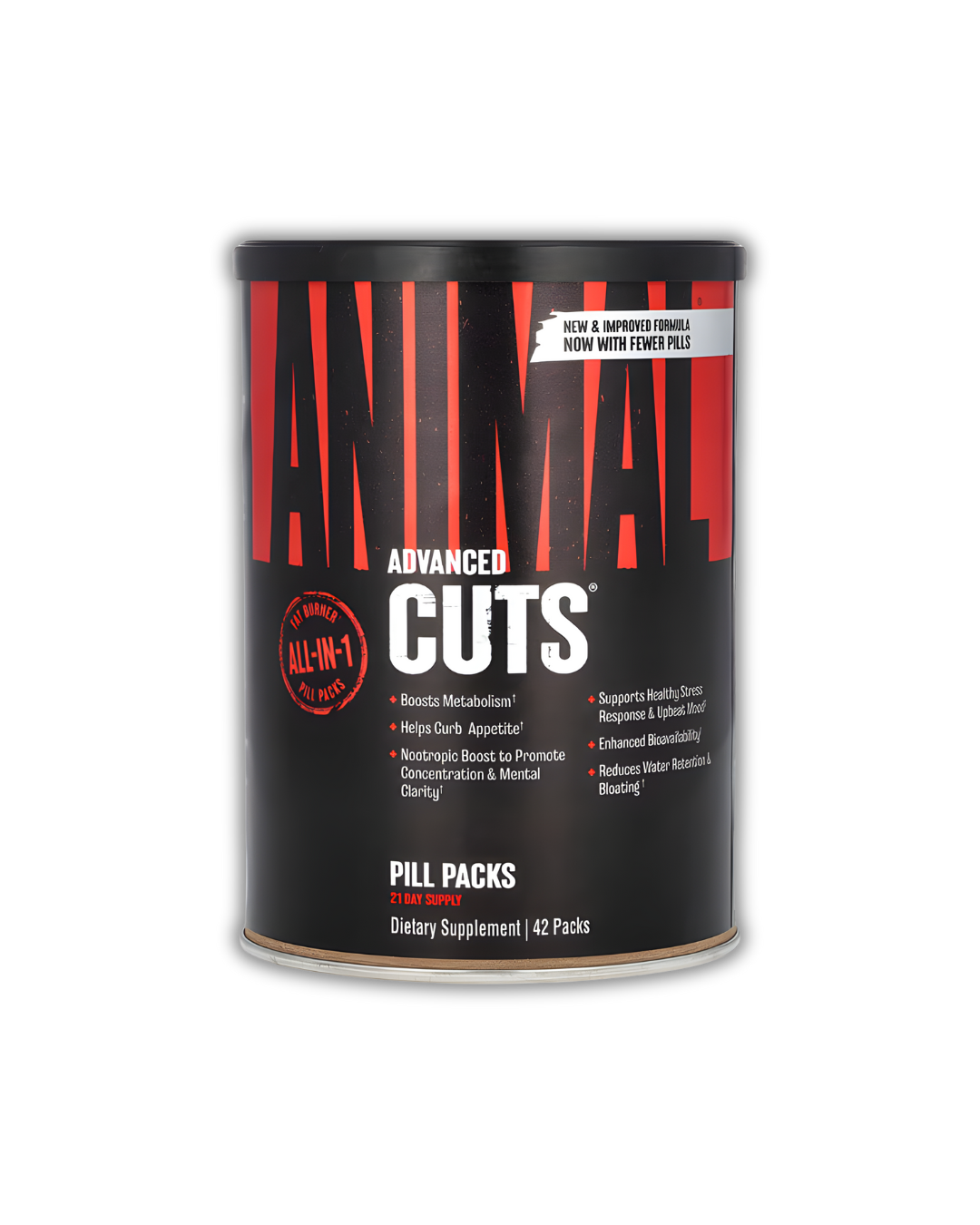 Animal Cuts es un quemador de grasa de alto rendimiento diseñado para quienes buscan una definición extrema. Cada paquete contiene una fórmula integrada con múltiples complejos (termogénico, metabólico, nootrópico, control de apetito, diurético y endocrino) para potenciar la quema de grasa, conservar la masa muscular y mejorar el enfoque durante la fase de corte.