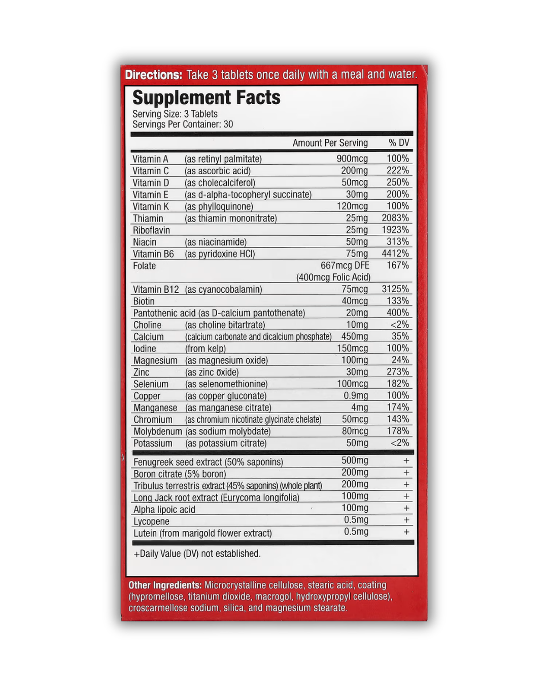 Integra más de 20 vitaminas y minerales esenciales con una potente combinación de extractos naturales orientados a apoyar la producción de testosterona libre, mejorar los niveles de energía y fortalecer el desempeño integral. Su perfil antioxidante contribuye a combatir el estrés oxidativo, favoreciendo una mejor recuperación, mayor resistencia y un estado físico más sólido y consistente.